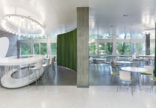 The Wave curtains transfer the green of the outer space into the interior. They are also tailored so that they are usable on both sides and can divide the space flexibly and perfectly into three smaller units if required. The often less attractive areas, such as vending machines, food return, etc. were integrated into white cubes, which created privacy walls to the toilets.
