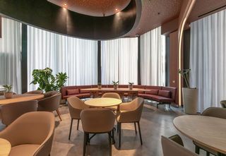 Over 250 curtains hang on Silent Gliss electric and hand-operated curtain tracks integrated into a KNX building automation system. This solution reduced glare and solar heat gain while significantly cutting embodied carbon through streamlined cabling and installation.