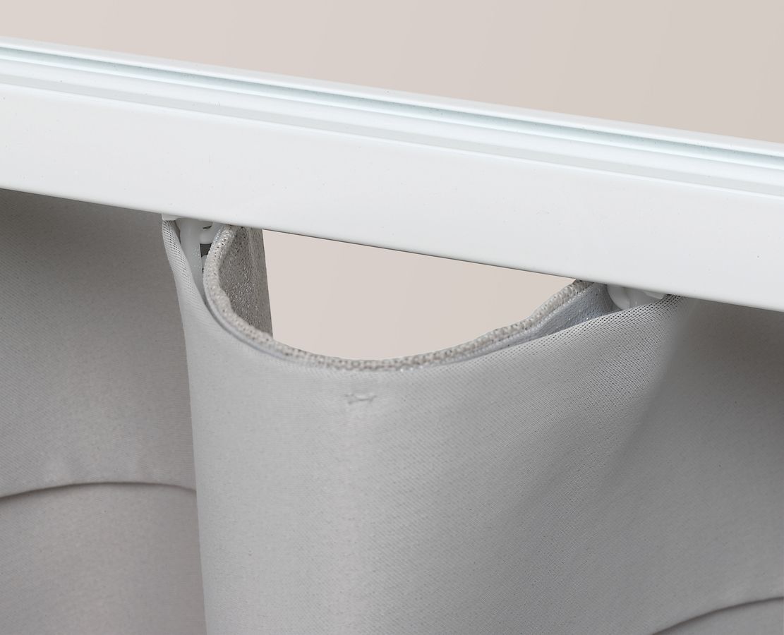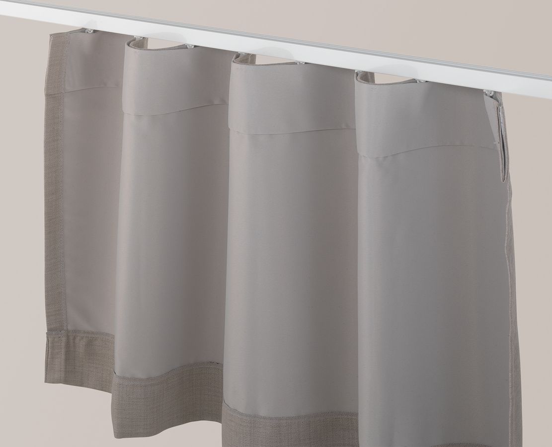 This option uses 165mm of additional fabric which impacts on the maximum drop possible for curtains without turning and joining. Also consider that the thickness of the heading will increase slightly and therefore the stack size. Please enquire at Silent Gliss.
